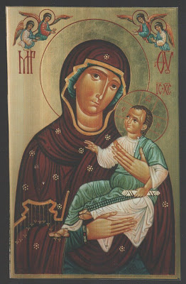 La Vergine indossa un maforion chiuso a “collarino”, di color porpora, con piccole rose perlinate. Nella parte superiore ci sono due coppie di angeli.Nell’icona originale, sotto il piede destro del Bambino vi è la figura dell’offerente. La Vergine col capo leggermente chino verso suo Figlio, regge con ambedue le mani Gesù , il quale ha il rotolo della Parola di Dio nella mano sinistra.